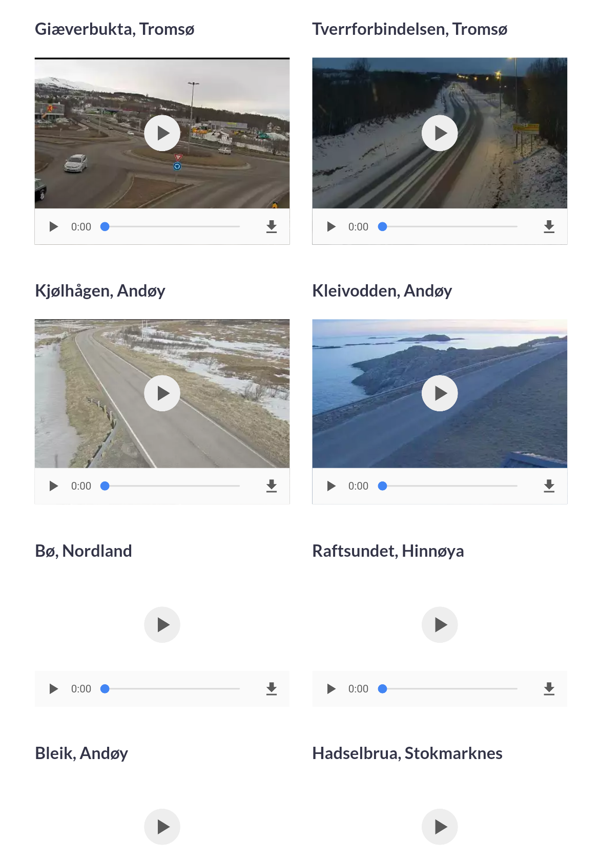 Dette fungerte helt fint, men det skulle vise seg å være litt utfordrende for mobile enheter. I nettlesere på PC-er kunne jeg se et stillbilde av video, første ramme tenker jeg. Jeg hadde ikke på autoplay for jeg ønsket ikke at alle videoene skulle spille av samtidig. Men noe måtte være årsaken til at de ikke vises riktig på telefoner og nettbrett, bare en hvit bakgrunn. Jeg tok derfor noen skjermbilder av videoene og la de inn som et poster="" parameter i videotaggen. Samtidig satte jeg preload="" til metadata eller none, slik at siden ikke laster noe unødvendig, foruten stillbildene jeg hadde lagt inn.
