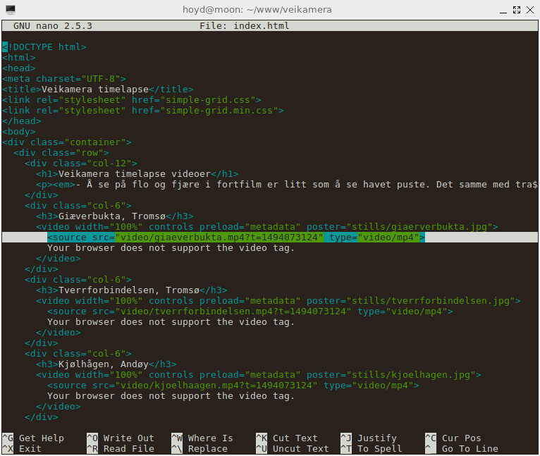 For å løse dette, fikk jeg skriptet til å generere et tidsstempel som parameter til adressen til videofilen, noe som ikke betyr noe for avspilling av videoklippet, men nettleseren behandler det som en unik fil og dermed slipper jeg bufferproblemet. Skriptet oppdaterer HTML-koden etter at filmklippene er produsert.