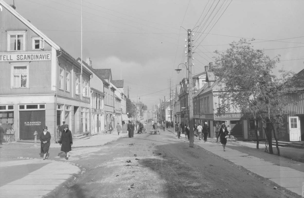 Det er et hyggelig bilde av Storgata, mot nord. En enorm stolpe med sikkert størm og telefoniledninger tar mye av bildet. Men til venstre ligger det som i dag er Burger King, den gangen Hotell Scandinavie.