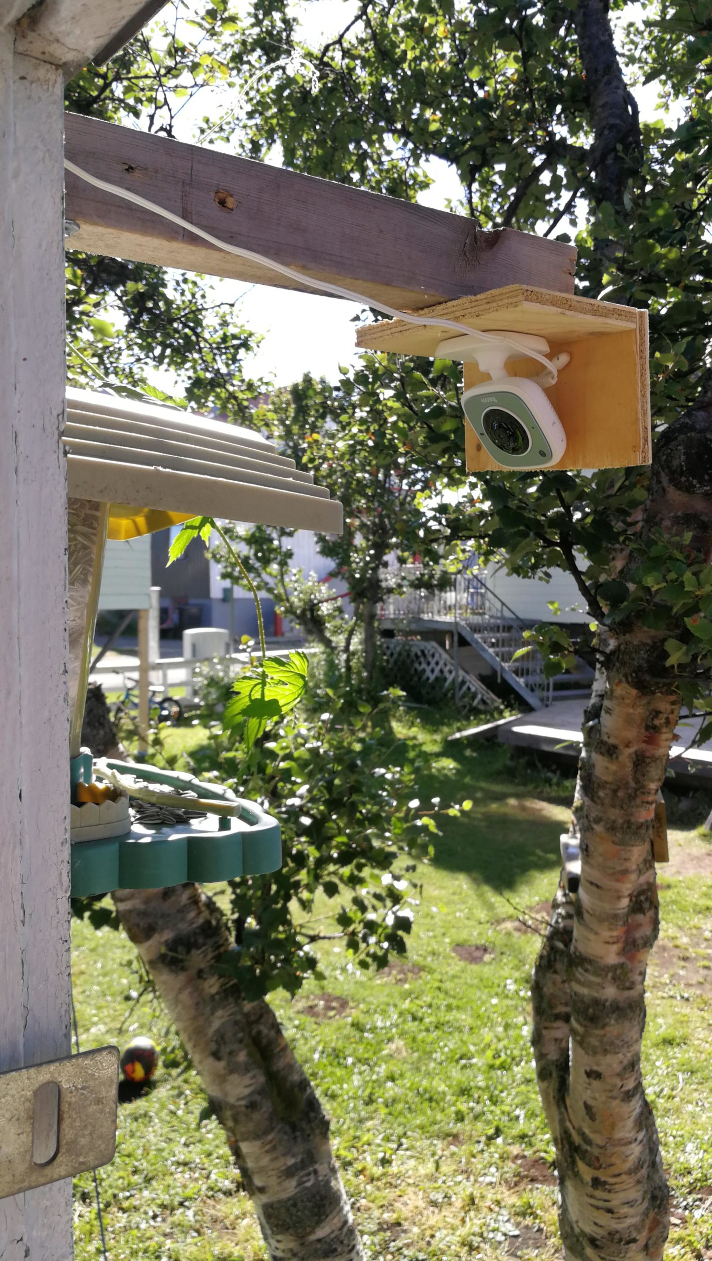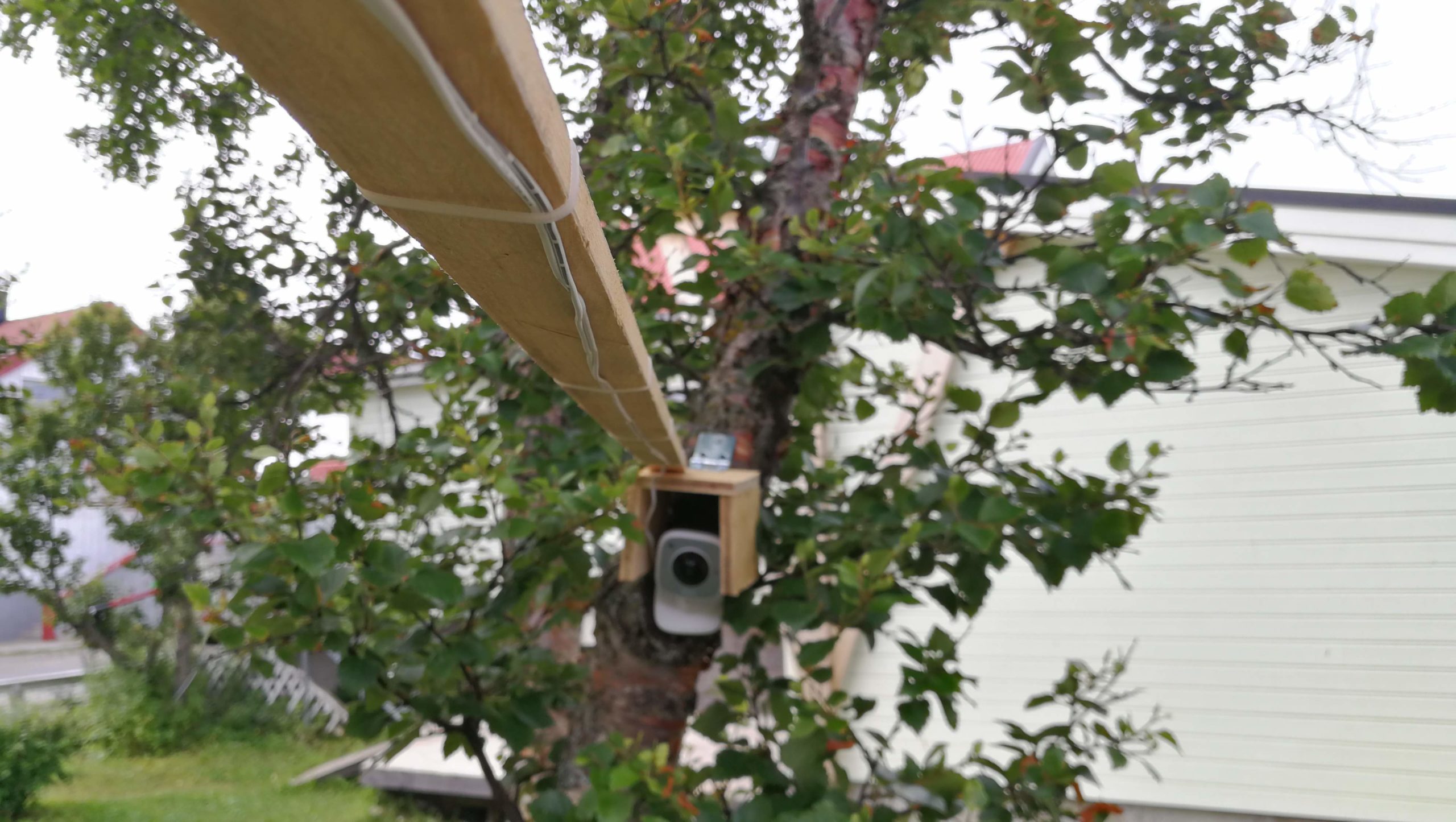 Jeg satte opp kameraet på det nye trådløse nettet “For the birds” og alt var klart til testing. Jeg tok noen bilder og litt video for å se hvordan vinkelen mot fuglemateren ble, men helt perfekt klarte jeg ikke å få det. Den er også litt langt unna og treet som kameraet er montert i vaier litt i vinden og dermed kan kameraet bevege seg litt og kanskje ende opp med å peke litt feil også.
