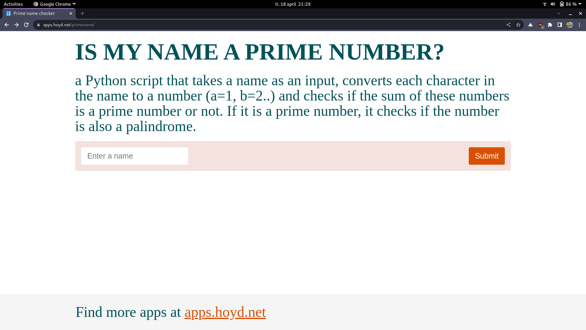 Jeg har i to omganger skrevet om et enkelt lite Python program som sjekker om summen av bokstavene i et navn omgjort til tall utgjør et primtall og deretter et palindromprimtall.