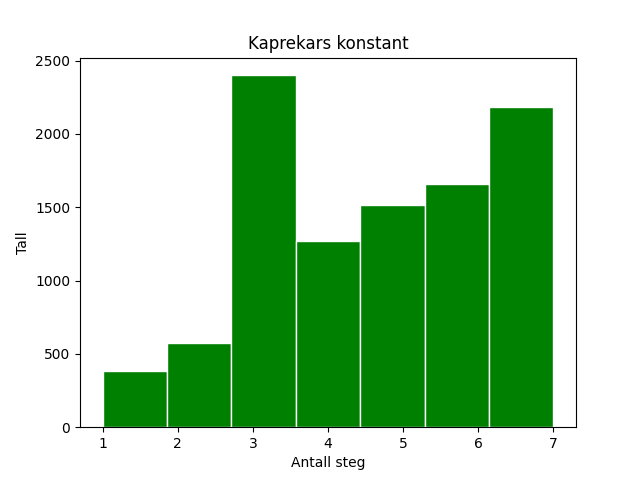 I går satt jeg på sofaen med den syv år gamle gutten min og jeg skravlet begeistret om 6174, og hvordan alle disse tallene til slutt lander der. Jeg slang sammen et Python-skript som vi kunne bruke til å prøve en haug med tall og se denne tallmagien skje. Gutten lurte hvor mange steg som trengs for å nå disse tallkonstantene, noe som var alt fra 1-7. Da lurte han på om det fantes noen tall hvor det tok åtte steg. Så jeg endret skriptet litt for at det selv skulle alle mulige tall mellom 0000 og 9999, men nei. Det tar maks syv steg å komme frem til 6174.