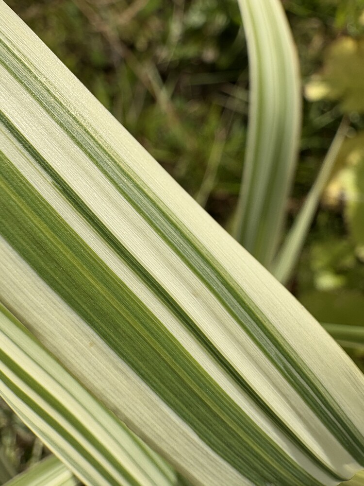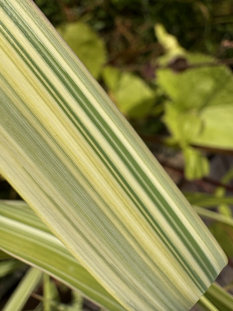 Jeg tok gikk nært på og tok et makrobilde. Det undret meg at mønsteret var slik det var, nesten som en kodet melding av smale streker i ulike grønnfarger. Nå er det ikke at det er en kodet melding, tror jeg, men etter å ha undersøkt det litt med appen PlantNet og nettleksikon, ja et leksikon, skyldes ulikhetene i fargene varierende klorofyllinnhold og kalles variegering. Du kan ofte se det på planter med flere grønn- eller andre farger på blad for eksempel.