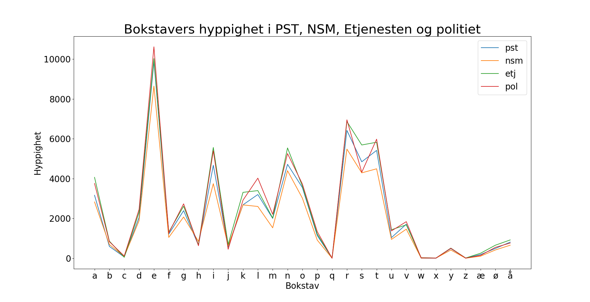 Det vises kanskje ikke i listen over, men sorterer vi de alfabetisk og plotter bruken i samme bilde får vi denne grafen, som viser at det er temmelig lik bruk av bokstaver gjennom rapportene: