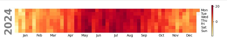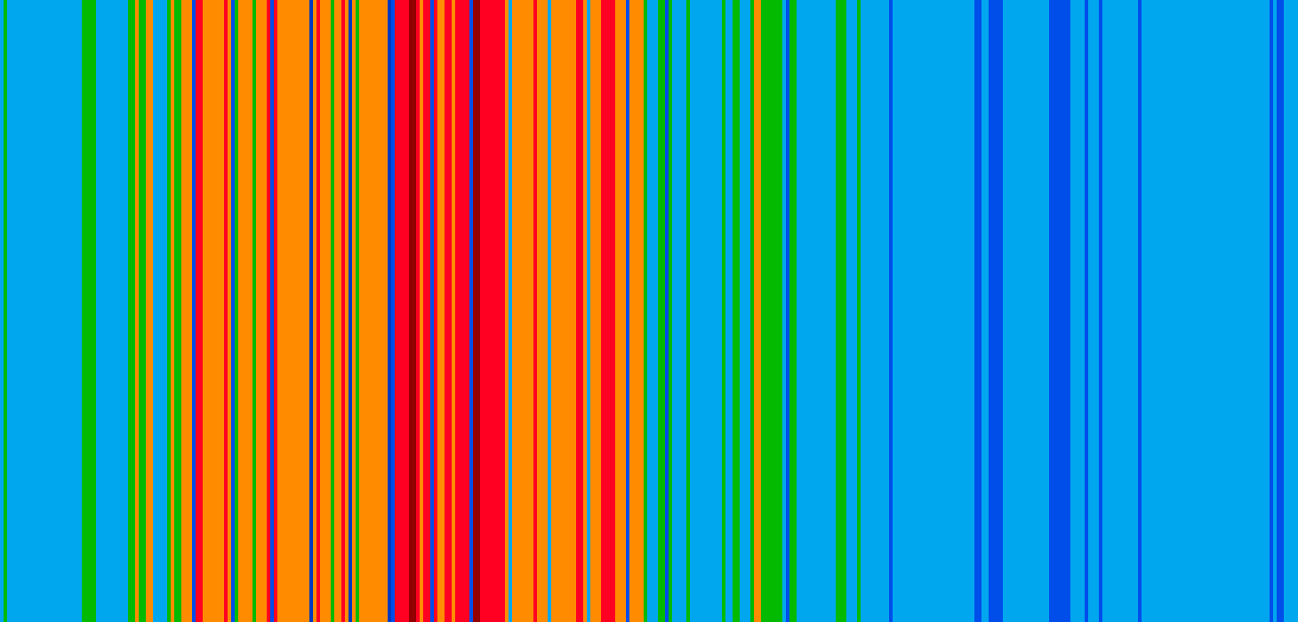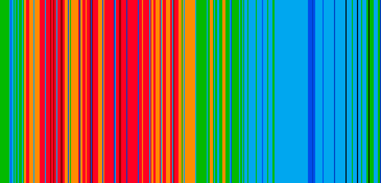 Scriptet lager en fargestripe for hver dag hvor hver tynne stripe representerer gjennomsnittstemperaturen den dagen. Bildene settes ved siden av hverandre til en kollasj.