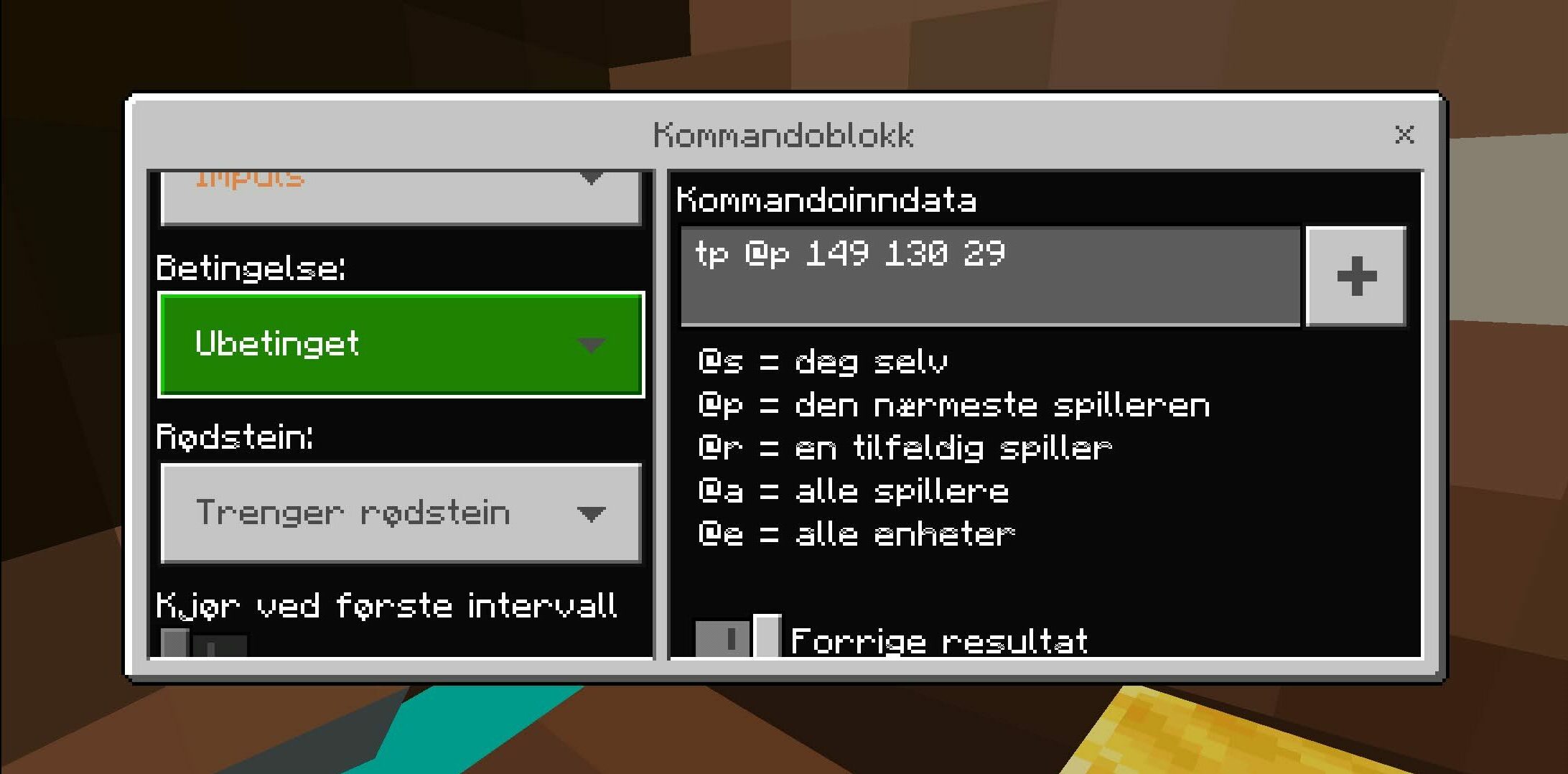 Jeg kom i skade å velge feil betingelse på blokkene første gang jeg satte de opp, og endte opp med at spilleren min teleporterte seg automatisk frem og tilbake i en uendelig løkke. Jeg måtte måtte hoppe ut og inn igjen av spillet for å komme til et annet sted, der spawnekoordinatene var satt.
