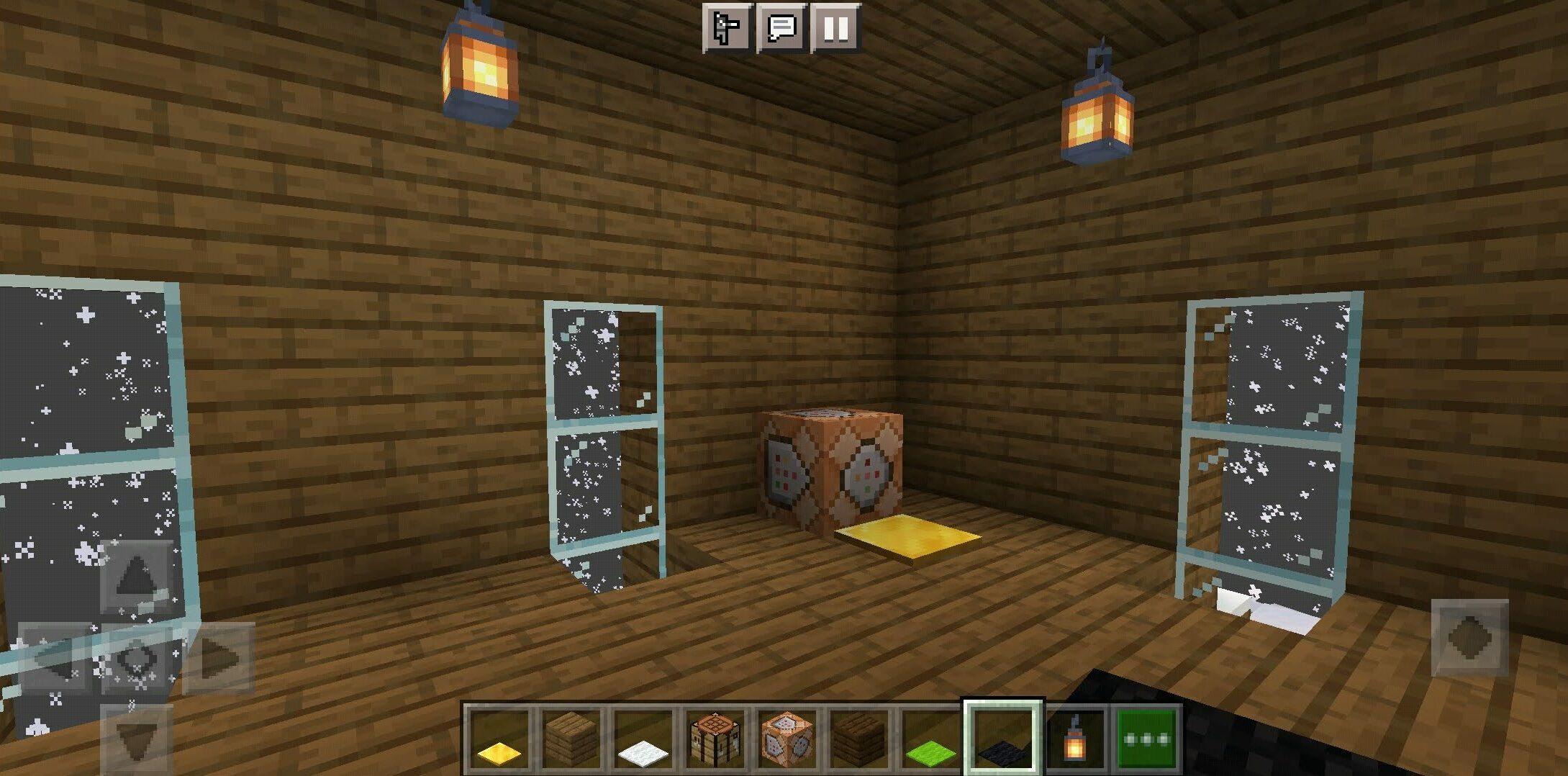 Dette med rødstein var litt snålt, men jeg måtte ved siden av kommandoblokken i huset, plassere en bryter av noe slag. Noe som kunne aktivere kommandoblokken og teleportere den spilleren som står nærmest. Det kan være en spake, en trykkflate eller en knapp. Jeg valgte en trykkflate, for en spake måtte tydeligvis settes tilbake manuelt hver gang, før den kunne brukes igjen.