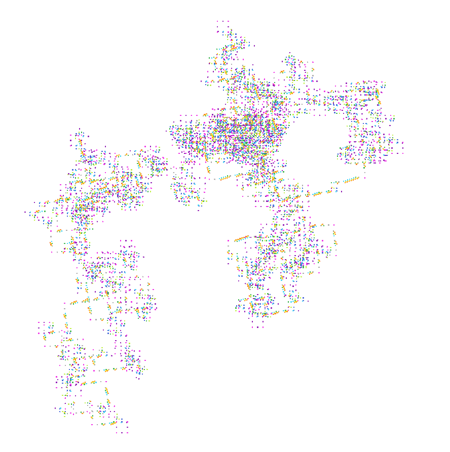 Jeg skrev et annet program som skulle ta for seg hvert av de 10 000 sifrene og tegne noe. Tegne noe basert på verdien i sifferet. De varierer naturlig nok bare mellom 0-9, men i en bestemt rekkefølge som vi nå vet. Programmet mitt tegner en firkant og bestemmer hvor neste firkant skal plasseres og hvilken farge den skal ha basert på verdien 0-9. Når dette er gjort lagres dette til en grafikkfil som du straks skal få se.
